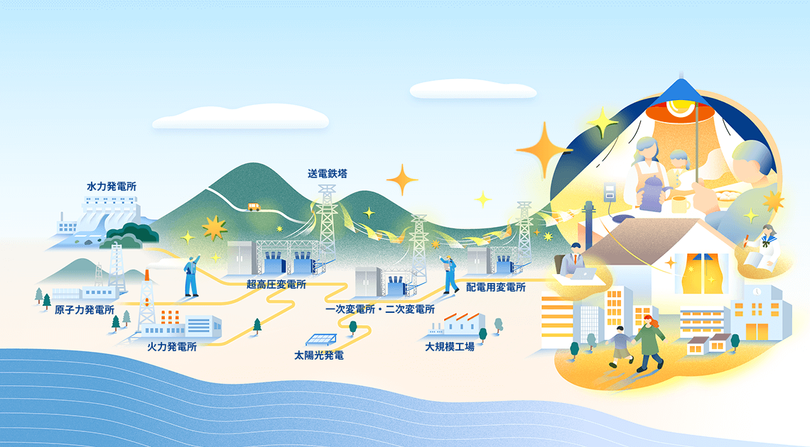 発電所で生み出された電気は、さまざまな設備を通って、皆さまの元に届きます。