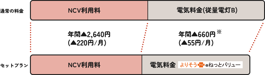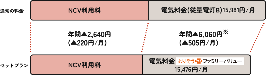 NCVが提供する「ニコニコケーブルテレビ」または「光インターネット」と、東北電力が提供する電気料金プラン「よりそう+ファミリーバリュー」、「よりそう+eねっとバリュー」、「よりそう+ナイト&ホリデー」いずれかをセットでご契約いただくと、「ニコニコケーブルテレビ」または「光インターネット」のいずれかをご利用のお客さまは毎月110円(税込)を割引し、両サービスをご利用のお客さまは毎月220円(税込)割引いたします。