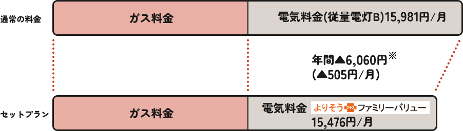 - ※上記モデルケースは、電気料金プランを「従量電灯B」から「よりそう+ファミリーバリュー」、「よりそう+eねっとバリュー」へご変更いただき、かつよりそうeねっとのご利用明細サービスのご利用とクレジットカード支払いによるポイントを新たに獲得される場合であり、既にいずれかのサービスを受けられている場合はこの限りではありません。