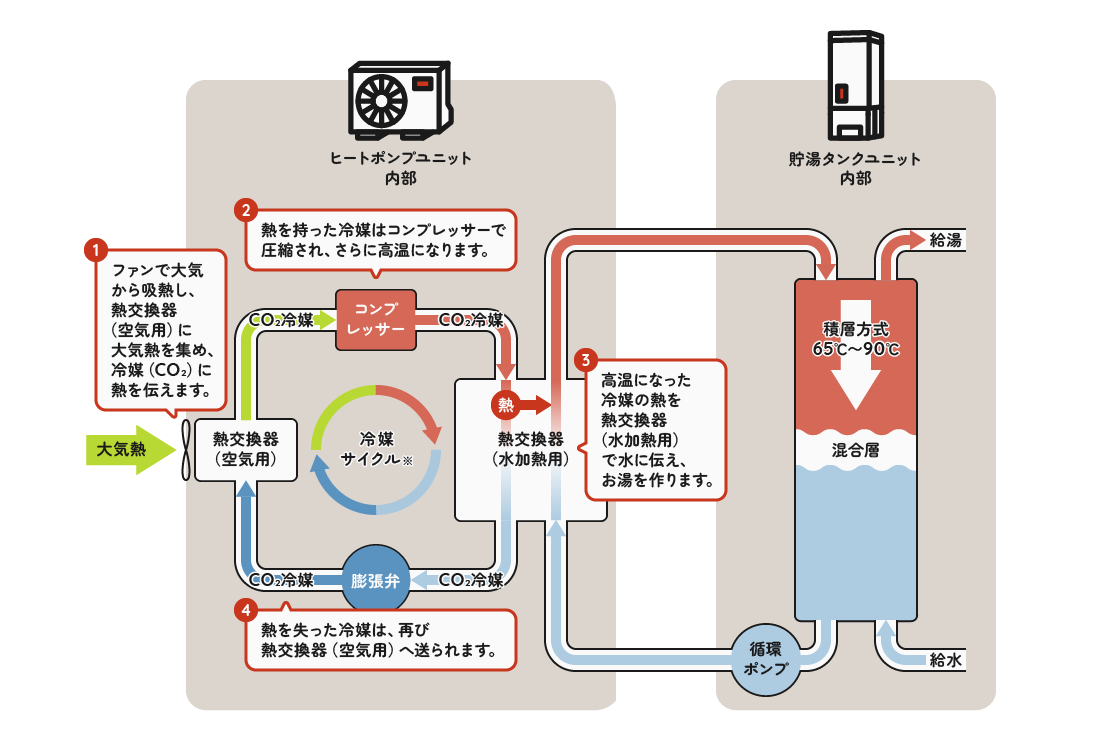 この技術を利用したエコキュートは、空気の熱と高温沸き上げ特性に優れた自然冷媒(CO2)を活用して、効率良くお湯を沸かします。電気は熱エネルギーとしてではなく、熱を運ぶ動力源として使われるため、消費電力以上の熱量を得ることができます。