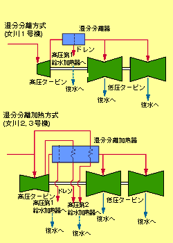 発電に用いる蒸気は、タービンの羽根を痛めないよう湿分を除去する必要があり、1号機では高圧タービンと低圧タービンとの間に湿分分離器を設置し、蒸気の湿分を取り除いております。2,3号機ではタービンの熱効率を向上させるため、湿分分離器で蒸気の湿分を取り除くとともに、高温の蒸気の熱の一部を利用して低圧タービンに送る蒸気を加熱する「湿分分離加熱方式」を採用しております。 |