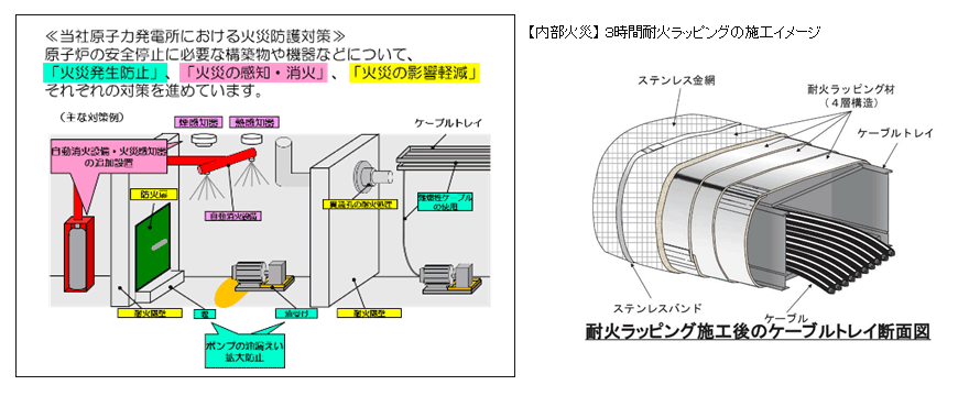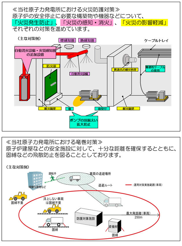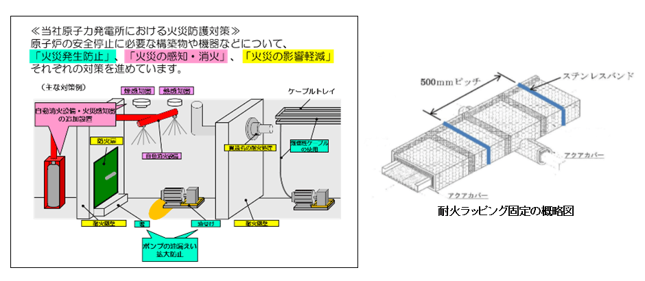 原子炉の安全停止に必要な構築物、系統および機器が設置される火災区域または火災区画の消火設備について、火災発生防止、火災の感知及び消火、火災の影響軽減などを考慮した火災防護対策などを説明しました。