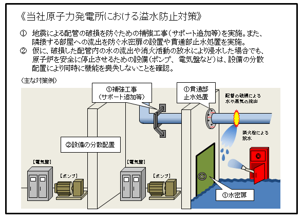 原子炉施設内において、溢水が発生した場合においても、原子炉建屋内設備の安全機能を損なわないことや発生した溢水が管理区域外へ漏えいしないことを説明しました。