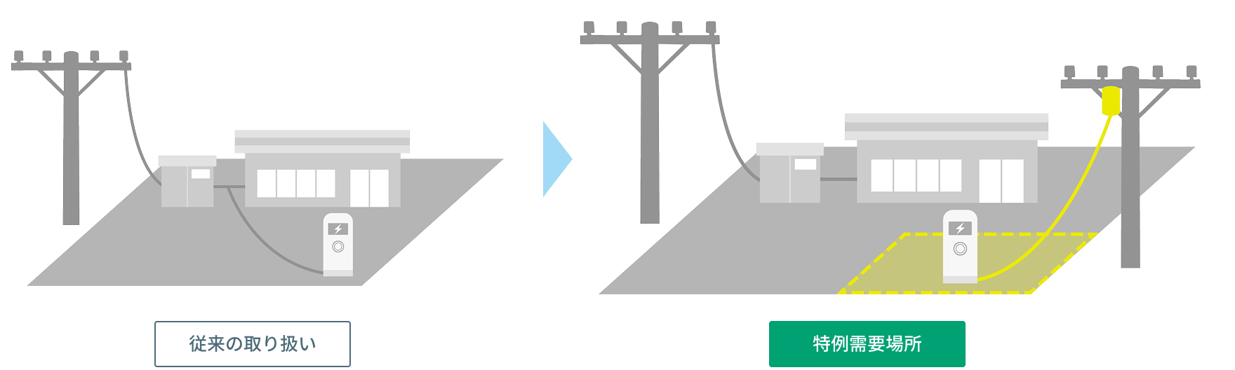 ※1特例需要場所とは、「温室効果ガスなどの排出の抑制のための措置に資する設備が設置されている必要最小限の場所」を指します。EV充電設備に関する特例需要場所は、2021年4月の電気事業法施行規則の一部改正に伴い、「一需要場所複数引込(特例需要場所)」の適用が可能になりました。(お客さまの設備形態ならびに周囲の設備状況によって特例需要場所を適用できない場合もあります)