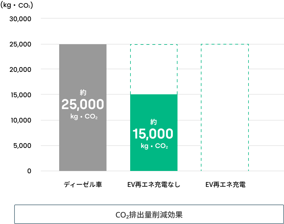 ※年間走行距離:42,000km、平均燃費(国交省HP「自動車燃費一覧_2025年3月」参照し当社にて設定):4.5km/L、軽油価格(経産省HP「石油製品価格調査_2025年10月14日時点」参照):154.8円/L、電費(当社設定):1.2km/kWh、東北電力轄hウ向けプラン(業務用電力)その他季:20.63円/kWh(燃料費など調整額及び再エネ賦課金を除く)、軽油排出係数(環境省HP参照):2.619tCO2/kL、東北電力2024年度調整後排出係数(非再エネプラン):0.422kg-CO2/kWh,(再エネプラン):0.000kg-CO2/kWh、より試算。