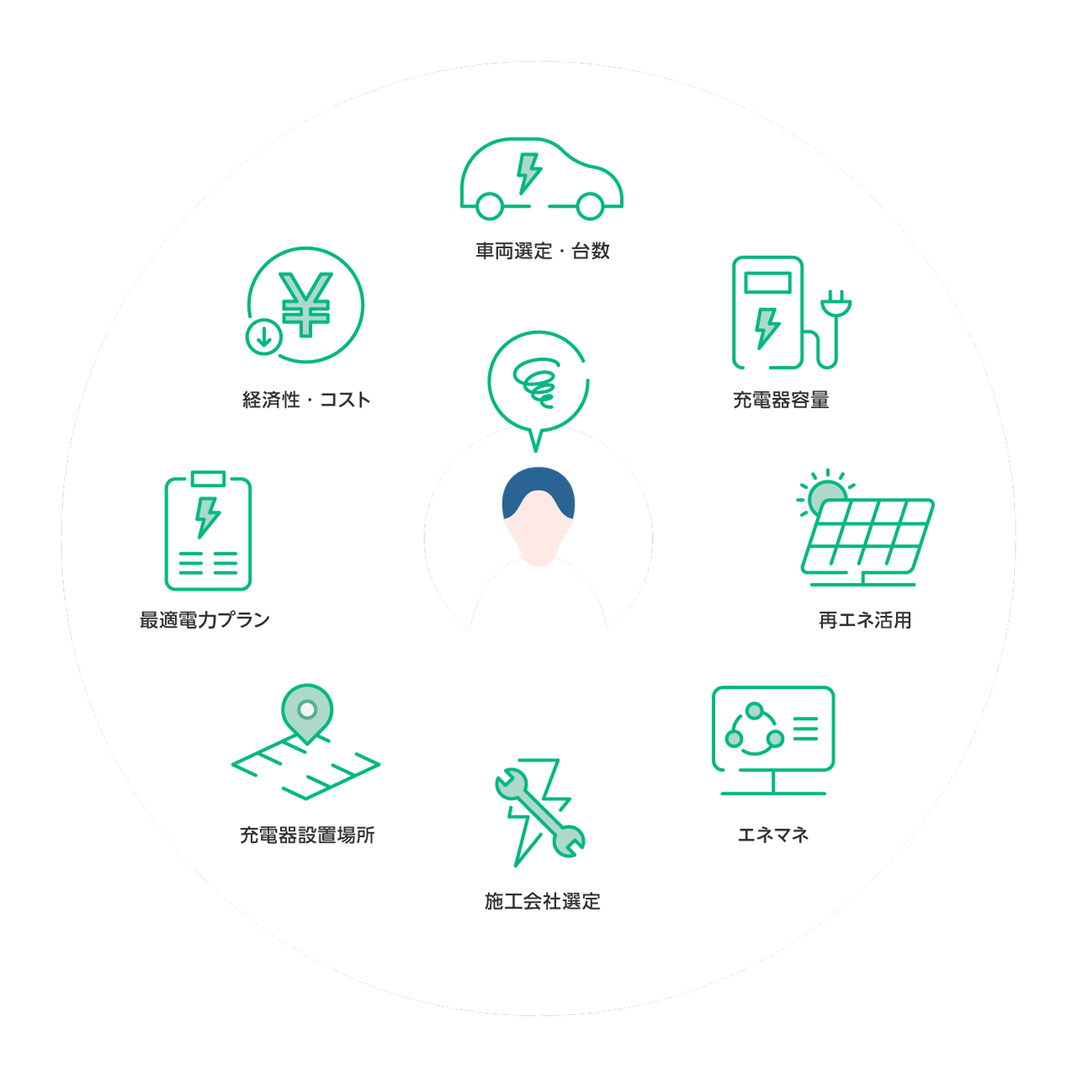 - お客さまの課題や取り組み内容によって費用が変わります。ヒアリングおよび充電器設置場所の現地調査のうえで、お見積りを提出いたします。