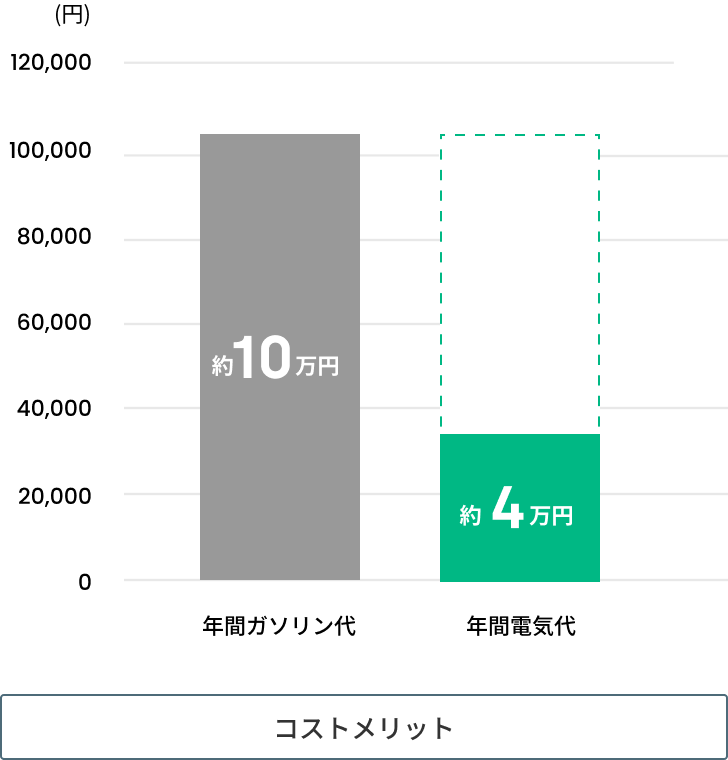 ※年間走行距離:12,000km、平均燃費(国交省HP「自動車燃費一覧_2025年3月」参照):19.8km/L、ガソリン価格(経産省HP「石油製品価格調査_2025年10月14日時点」参照):174.7円/L、電費(当社設定):7.5km/kWh、東北電力轄hウ向けプラン(業務用電力)その他季:20.63円/kWh(燃料費など調整額及び再エネ賦課金を除く)、ガソリン排出係数(環境省HP参照):2.322tCO2/kL、東北電力2024年度調整後排出係数(非再エネプラン):0.422kg-CO2/kWh、(再エネプラン):0.000kg-CO2kWh、より試算。
