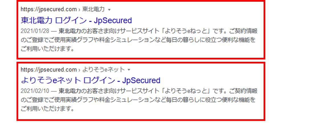 ※2 検索結果は一部の例です。表示例以外にも、「JpSecured」と表記されているサイトや、URLが正規のサイトURLでないサイトはクリックしないようご注意ください。