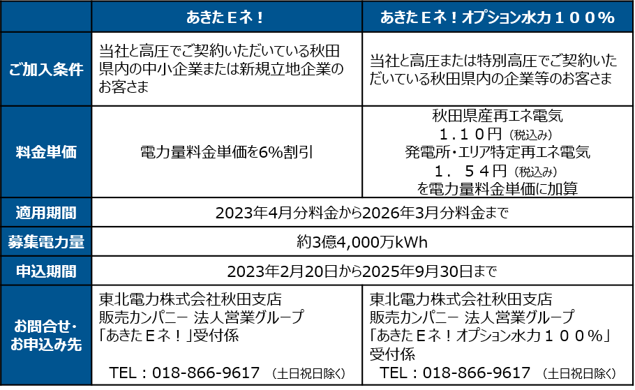 また、CO2排出削減に取り組む企業等のお客さまへCO2を排出しない電気を供給することで、再生可能エネルギーの地産地消に繋げる電気料金プラン「あきたEネ!オプション水力100%」についても、新たに提供区分を設定し、2023年4月以降も継続いたしますので、次のとおりお知らせいたします。
