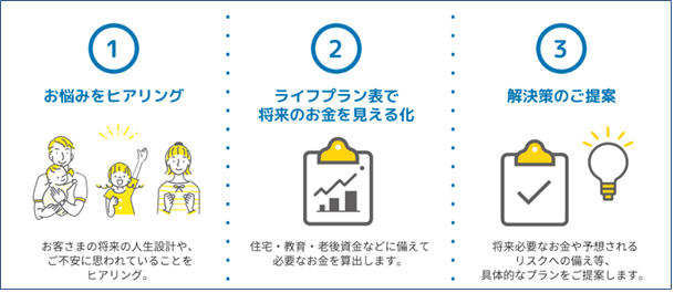 本サービスでは、東北電力フロンティアおよび東京海上日動あんしん生命が提携する経験・実績豊富なファイナンシャルプランナーに、家計の悩みを無料で相談することができ、以下の流れで具体的な解決策をご提案いたします。お客さまのご都合にあわせて、ご自宅への訪問やオンラインなどでの面談が可能です。