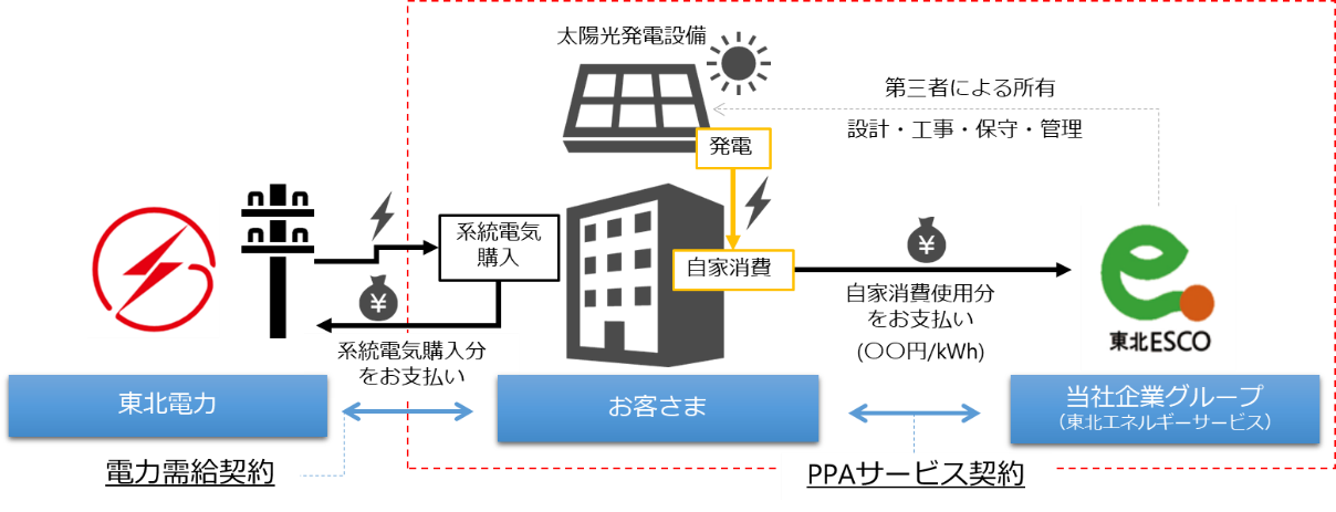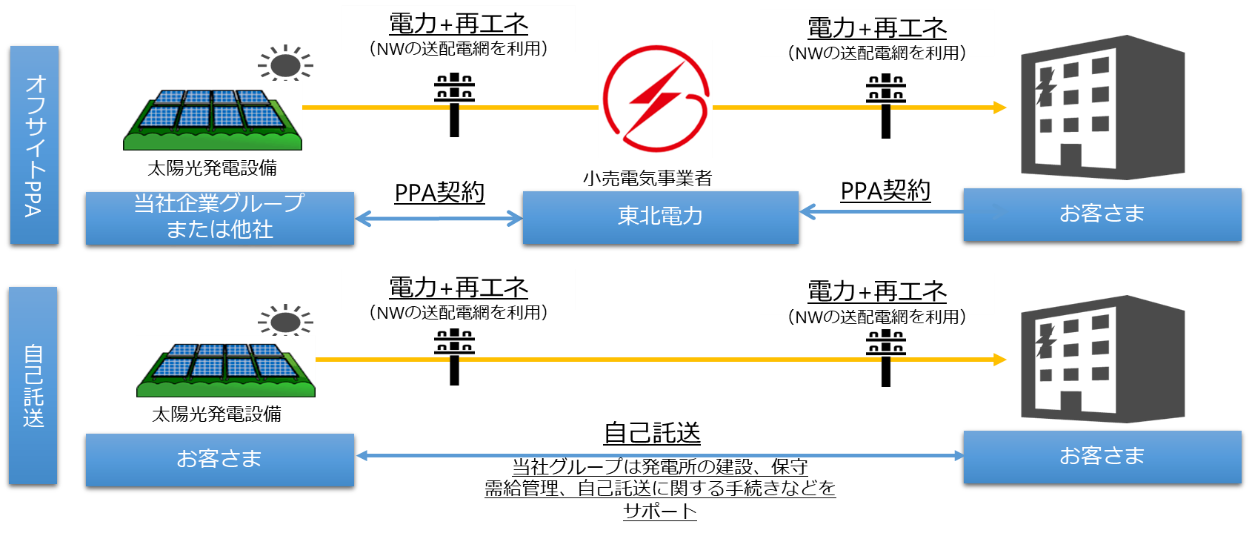 このようなニーズにお応えするため、これまでは、当社グループの東北エネルギーサービス株式会社(通称:「東北ESCO」)を中心に、コーポレートPPA事業※1のうち、太陽光発電によるオンサイトPPA※2を中心としたサービスを提供してまいりました。