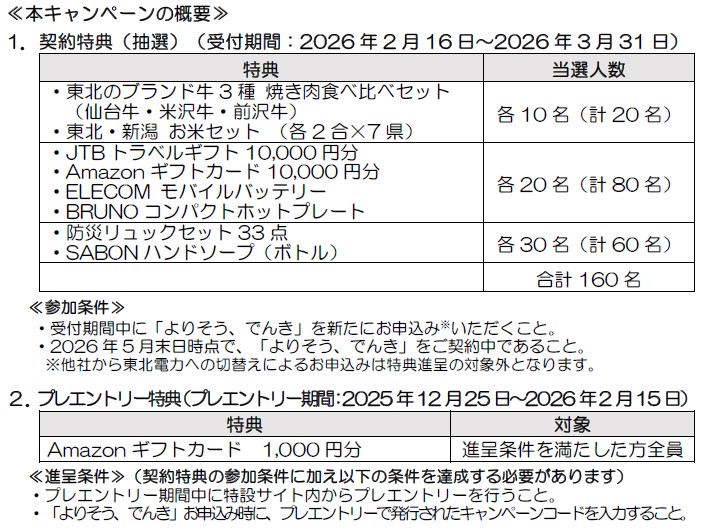 本キャンペーンでは、契約申込受付期間中(2026年2月16日から2026年3月31日)に首都圏向け電気料金プラン「よりそう、でんき」に新たにご加入いただいたお客さまの中から、抽選で合計160名様に、東北・新潟のお米セットなどの新生活 応援賞品をプレゼントいたします。さらに、あらかじめプレエントリー期間中(2025年12月25日から2026年2月15日)にプレエントリーいただいた方には、もれなくAmazonギフトカード(1,000円分)をプレゼントいたします。