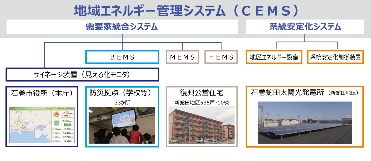 本事業は、東日本大震災最大の被災地である石巻市において、再生可能エネルギーを活用した「低炭素なエコタウン」と、災害時に「灯りと情報が途切れない安全・安心なまちづくり」を目指して、モデル地区において電力の需給バランスの調整などを図る「地域エネルギー管理システム」を導入するものです。