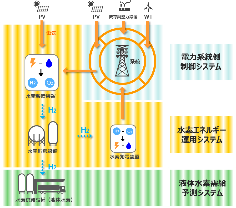 本事業では、太陽光発電や風力発電などの再生可能エネルギーを中心とした電気を活用して、福島県内に設置する最大1万kW級の水素製造装置で水素を製造することにより、電力系統の安定運用に貢献するシステムの検討を行います。製造した水素は、水素発電装置により電力系統の調整力として活用するほか、液化し東北エリア内外へ供給することを想定しています。水素エネルギー運用システム、電力系統側制御システム、液体水素需要予測システムが協調した新たな制御システムにより、水素製造量と水素発電量、および水素ガス供給量の最適運用を目指します。