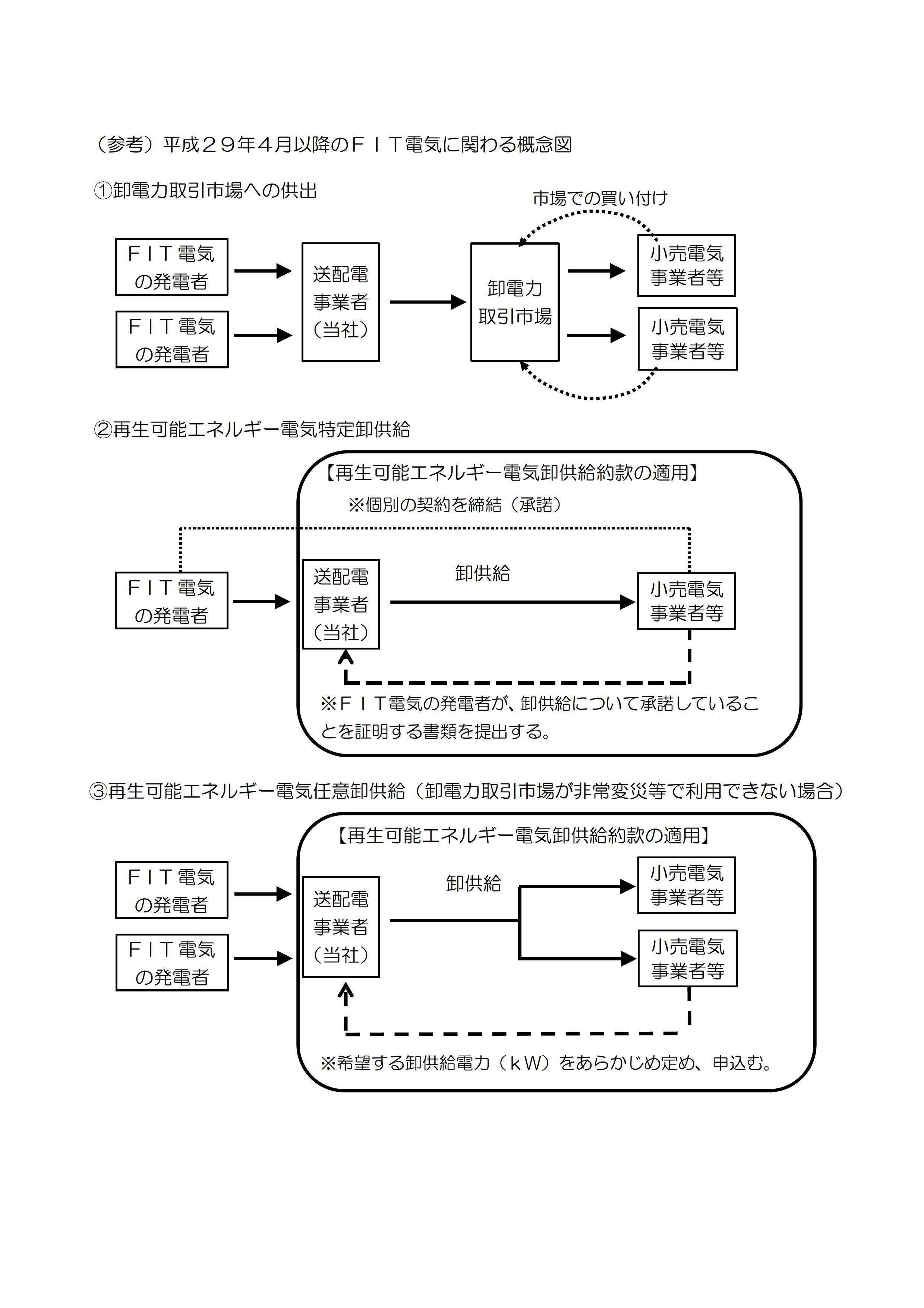 ・再生可能エネルギー電気任意卸供給の場合(非常変災等で卸電力取引市場が利用できない場合)、希望する卸供給電力(kW)をあらかじめ定め、当社へ申込みしていただきます。また、託送供給等約款に則り、当社と接続供給契約を締結していただく必要があります。(参考:概念図③参照)