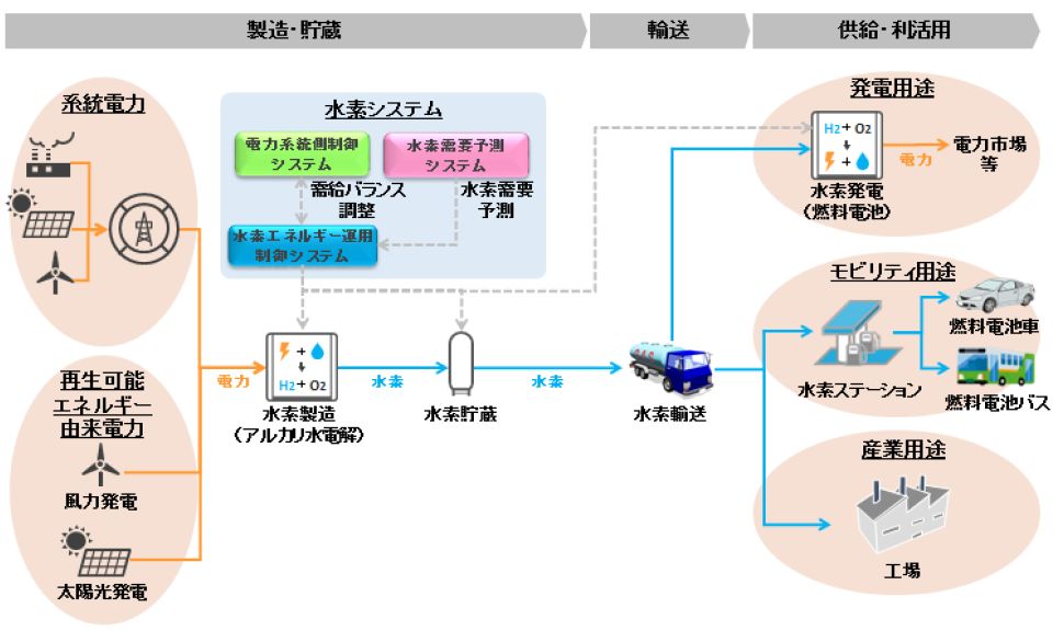 本事業では、再生可能エネルギーの導入拡大を見据えた電力系統の需給バランス調整(デマンドレスポンス)のための水素活用事業モデルおよび水素販売事業モデルを確立させることで、新たな付加価値を有する大規模水素エネルギーシステムの開発・実用化を目指します。本システムは、市場における水素需要を予測する水素需要予測システムと電力系統の需給バランスを監視制御する電力系統制御システムからの情報をもとに、水素エネルギー運用システムが水素製造装置等を含めた最適運用を行うことで、再生可能エネルギーの利用拡大を実現します。