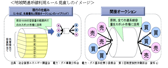 この度、連系線をより効率的に利用し、電気料金の最大限の抑制および事業者の事業機会の拡大を実現するため、「先着優先」ルールを廃止し、卸電力取引所で売買契約が成立した事業者へ利用枠を割り当てる「間接オークション」を全面的に導入するものです。