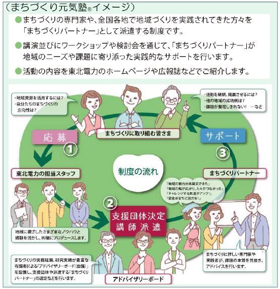 「まちづくり元気塾®」は、東北6県および新潟県で、地域活力の再生や自立に向けて地域が直面する課題解決に取り組む団体の活動を当社がお手伝いさせていただく制度です。