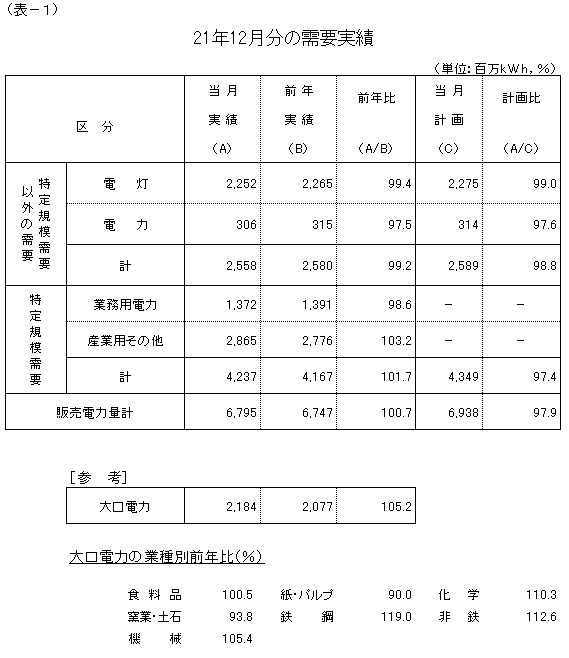 大口電力は、一部のお客さまにおける生産回復の動きに加え、平成20年12月分が大きく前年実績を下回った反動などから、対前年比105.2%の実績となり、平成20年10月分以来14カ月ぶりに前年実績を上回りました。