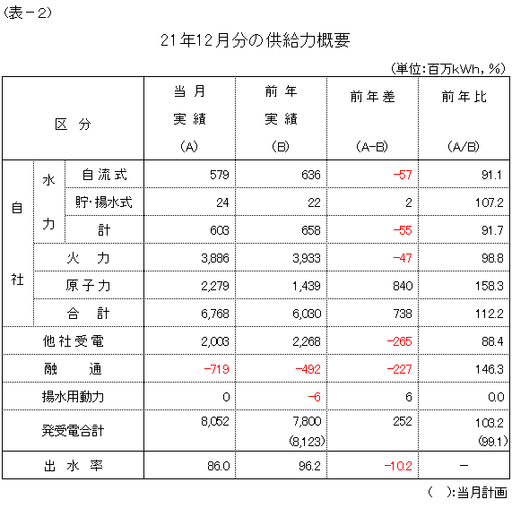 12月の発受電電力量の合計は、80億5,200万kWhとなり、対前年比103.2%、対計画比99.1%の実績となりました。
