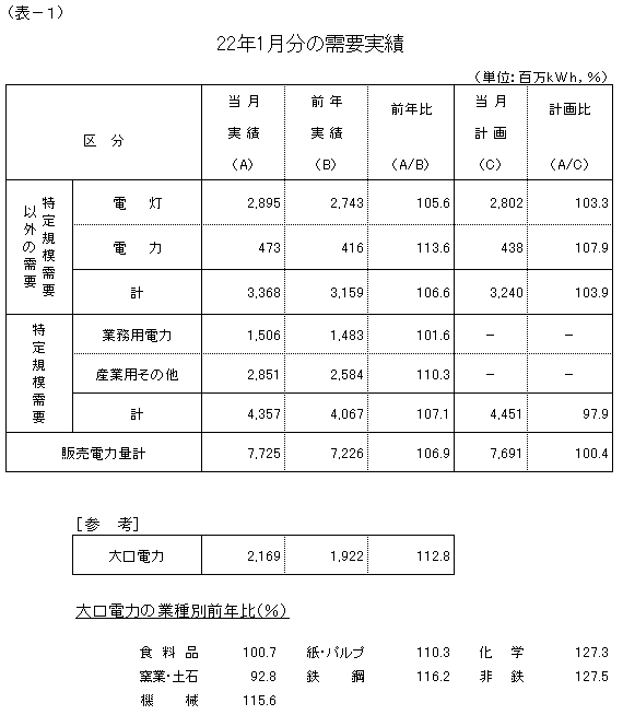 大口電力は、一部のお客さまにおける生産回復の動きに加え、平成21年1月分が大きく前年実績を下回った反動などから、対前年比112.8%の実績となり、2カ月連続で前年実績を上回りました。