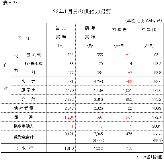1月の発受電電力量の合計は、84億2,100万kWhとなり、対前年比106.0%、対計画比99.7%の実績となりました。