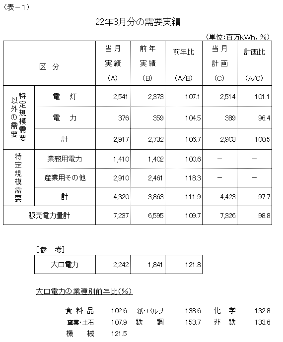 大口電力は、生産回復の動きに加え、平成21年3月分が大きく前年実績を下回った反動などから、対前年比121.8%の実績となり、4カ月連続で前年実績を上回りました。