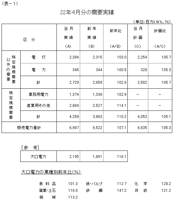 大口電力は、生産回復の動きに加え、平成21年4月分が大きく前年実績を下回った反動などから、対前年比116.1%の実績となり、5カ月連続で前年実績を上回りました。