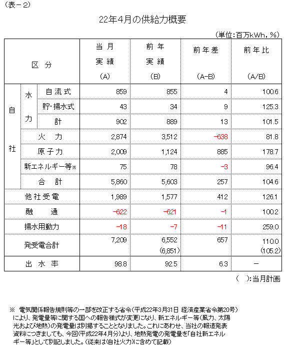 ※ 電気関係報告規則等の一部を改正する省令(平成22年3月31日 経済産業省令第20号)により、発電量等に関する国への報告様式が変更になり、新エネルギー等(風力、太陽光および地熱)の発電量は別掲することとなりました。これにあわせ、当社の報道発表資料につきましても、今回(平成22年4月分)より、地熱発電の発電量を「自社新エネルギー等」として別記しました。(従来は(自社火力)に含めて記載)