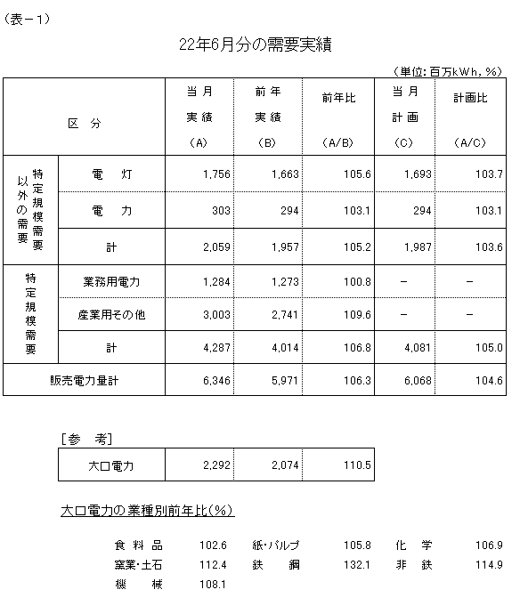 大口電力は、生産回復の動きに加え、平成21年6月分が大きく前年実績を下回った反動などから、対前年比110.5%の実績となり、7カ月連続で前年実績を上回りました。