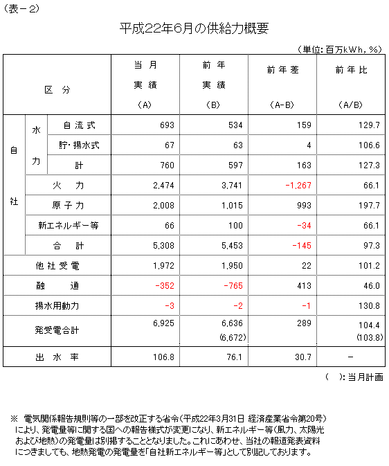 ※ 電気関係報告規則等の一部を改正する省令(平成22年3月31日 経済産業省令第20号)により、発電量等に関する国への報告様式が変更になり、新エネルギー等(風力、太陽光および地熱)の発電量は別掲することとなりました。これにあわせ、当社の報道発表資料につきましても、地熱発電の発電量を「自社新エネルギー等」として別記しております。