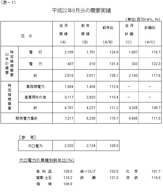 大口電力は、生産回復の動きに加え、平成21年9月分が大きく前年実績を下回った反動などから、対前年比109.3%の実績となり、10カ月連続で前年実績を上回りました。