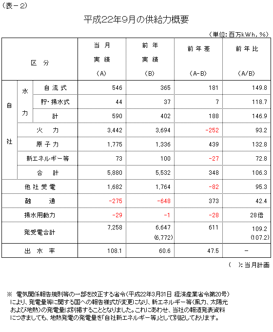 ※ 電気関係報告規則等の一部を改正する省令(平成22年3月31日 経済産業省令第20号)により、発電量等に関する国への報告様式が変更になり、新エネルギー等(風力、太陽光および地熱)の発電量は別掲することとなりました。これにあわせ、当社の報道発表資料につきましても、地熱発電の発電量を「自社新エネルギー等」として別記しております。