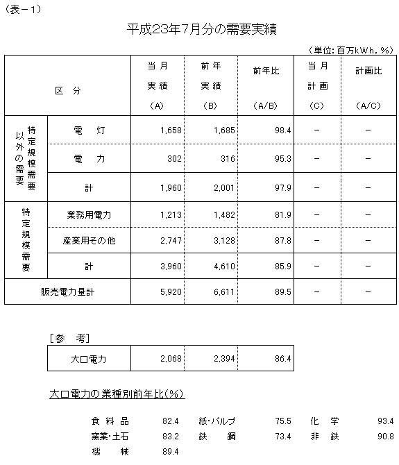 7月分の販売電力量は、59億2,000万kWh、対前年比89.5%の実績となり、東日本大震災の影響などにより、5カ月連続で前年実績を下回りました。
