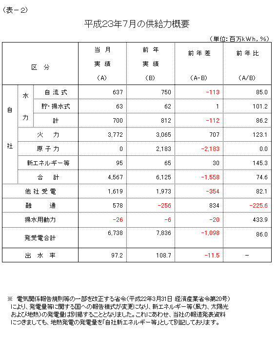 7月の発受電電力量の合計は、67億3,800万kWh、対前年比86.0%の実績となり、東日本大震災の影響などにより、5カ月連続で前年実績を下回りました。
