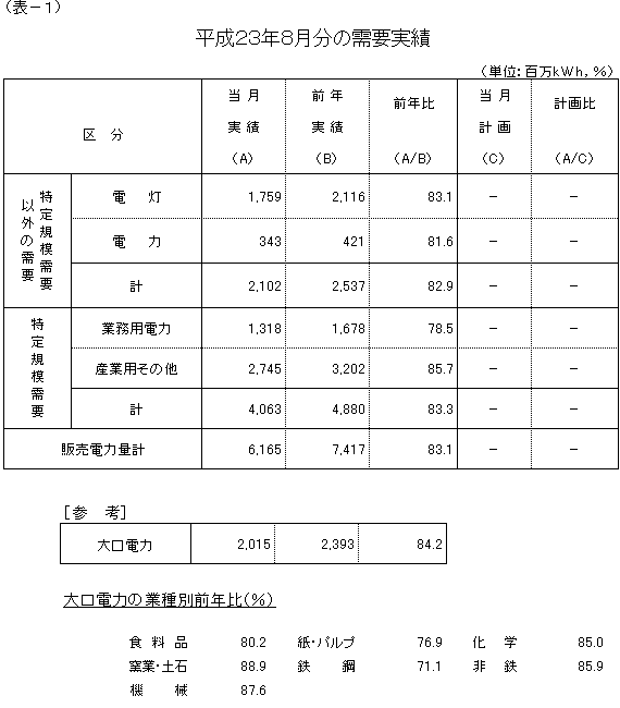 大口電力は、東日本大震災の影響、電力使用制限令の影響、前年の高気温の反動などにより、対前年比84.2%の実績となり、6カ月連続で前年実績を下回りました。