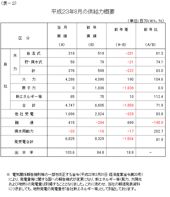 8月の発受電電力量の合計は、68億2,500万kWh、対前年比81.9%の実績となり、東日本大震災の影響などにより、6カ月連続で前年実績を下回りました。