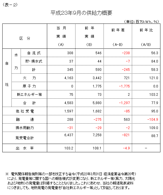 9月の発受電電力量の合計は、64億3,700万kWh、対前年比88.7%の実績となり、東日本大震災の影響などにより、7カ月連続で前年実績を下回りました。