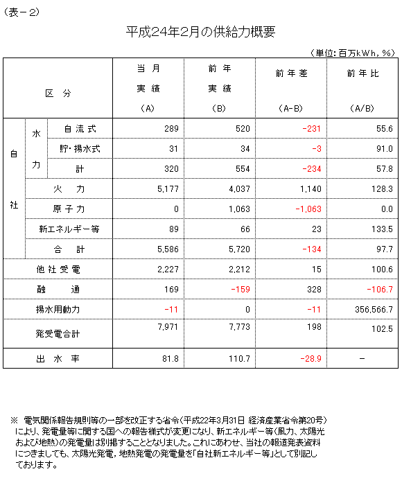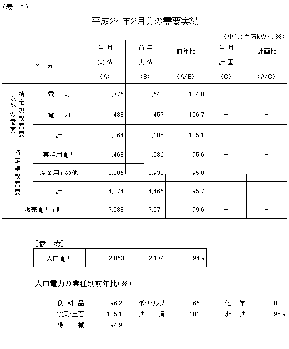 大口電力は、閏年の影響により前年と比較して検針期間が長かったものの、東日本大震災の影響などにより、対前年比94.9%の実績となり、12カ月連続で前年実績を下回りました。