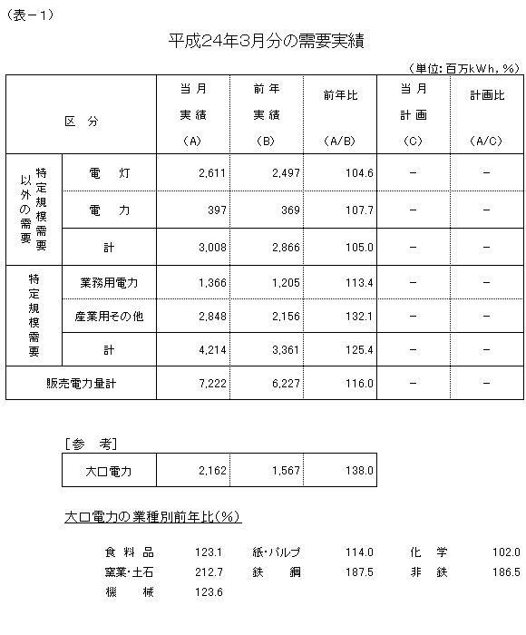 大口電力は、東日本大震災が発生した前年3月からの反動などにより、対前年比138.0%の実績となり、平成23年2月以来、13カ月ぶりに前年実績を上回りました。