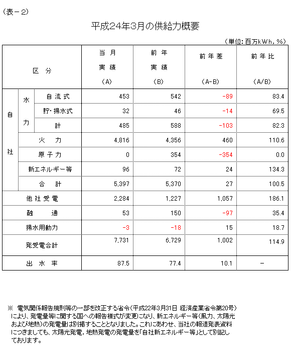 3月の発受電電力量の合計は、77億3,100万kWhと、東日本大震災の発生に伴い発受電電力量が大幅に減少した前年3月からの反動などにより、対前年比114.9%の実績となり、2カ月連続で前年実績を上回りました。