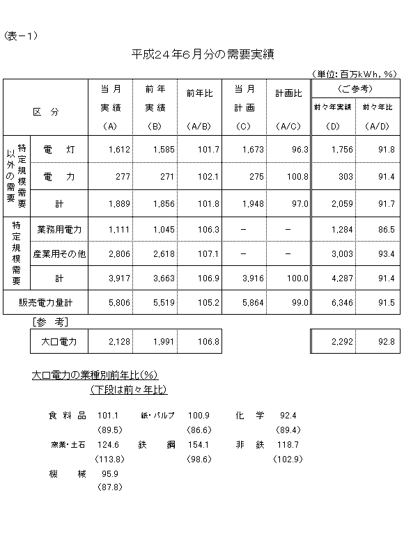 大口電力は、東日本大震災の影響を受けた前年6月からの反動などにより、対前年比106.8%の実績となり、4カ月連続で前年実績を上回りました。