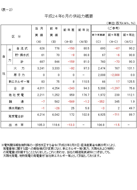 なお、東日本大震災の影響で、前年度は発受電電力量が大幅に減少しておりますので、ご参考として前々年度との比較も表−2に掲載しております。