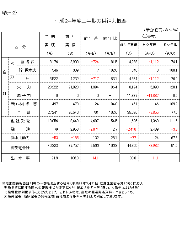 なお、東日本大震災の影響で、前年度は発受電電力量が大幅に減少しておりますので、ご参考として前々年度との比較も表−2に掲載しております。
