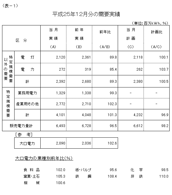 12月分の販売電力量は、64億9,300万kWh、対前年比96.5%の実績となりました。震災からの復興や大口電力における操業水準の持ち直しの動きはみられるものの、検針期間が短かったことや気温が前年に比べ高めに推移したことによる暖房需要の減少などから、2ヵ月ぶりに前年実績を下回りました。