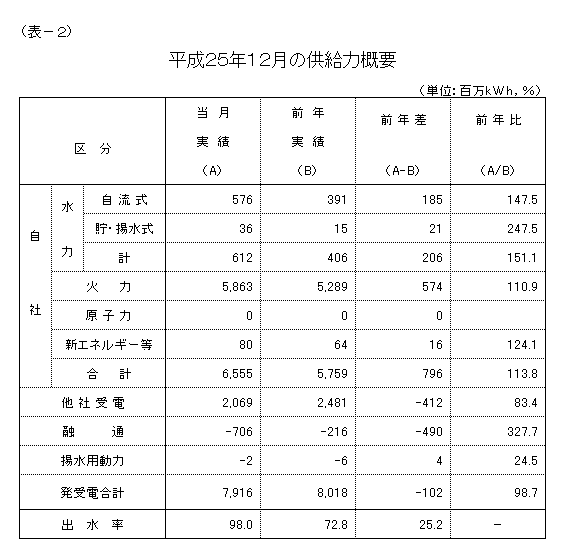 12月の発受電電力量の合計は、上旬の気温が高めに推移したことによる暖房需要の減少などから、79億1,600万kWh、対前年比98.7%の実績となり、3ヵ月ぶりに前年実績を下回りました。