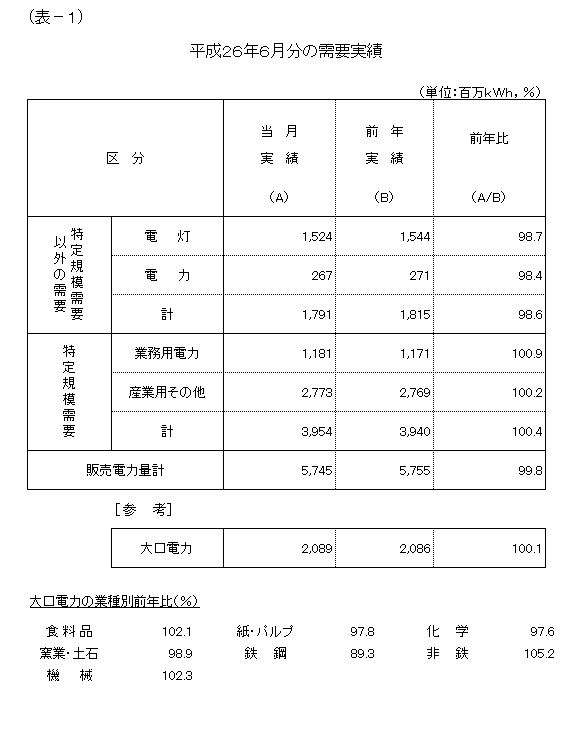 電灯は、東日本大震災からの復興の動きはあるものの、節電への取り組みなどから、対前年比98.7%の実績となり、2カ月連続で前年実績を下回りました。