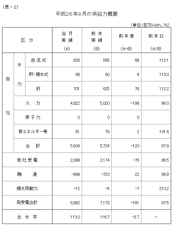 8月の発受電電力量の合計は、中旬以降の気温が前年に比べ低かったことによる冷房需要の減少などから、69億9,200万kWh、対前年比97.5%の実績となり、2カ月ぶりに前年実績を下回りました。