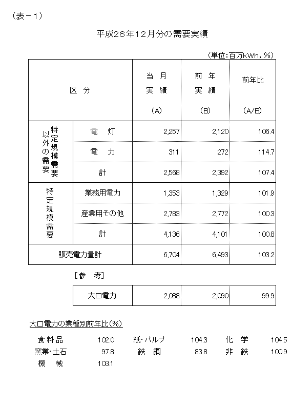 大口電力は、復興需要や一部業種で生産回復の動きが続いているものの、一部での生産減や自家発稼働増加の影響などから、対前年比99.9%の実績となりました。