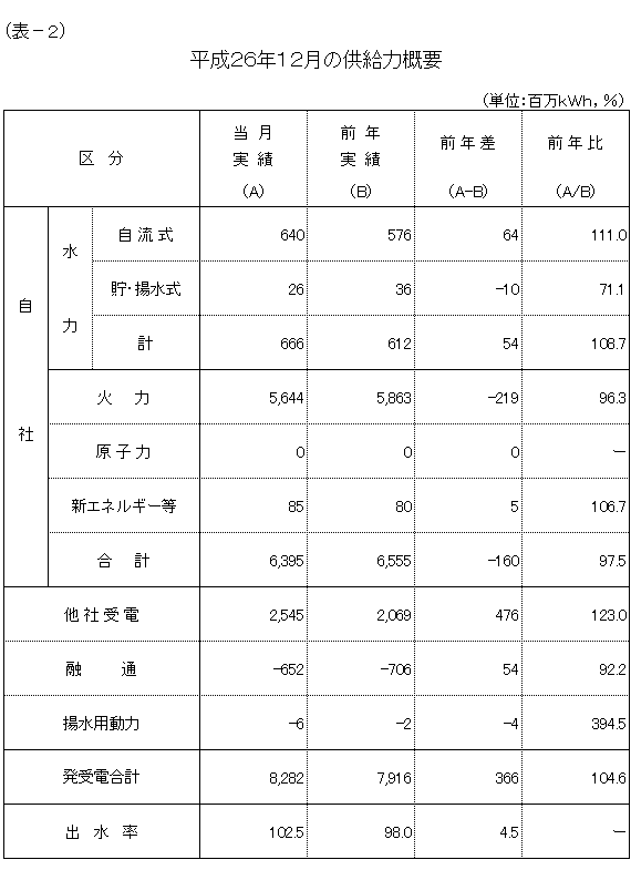 12月の発受電電力量の合計は、82億8,200万kWh、対前年比104.6%の実績となり、5カ月ぶりに前年実績を上回りました。